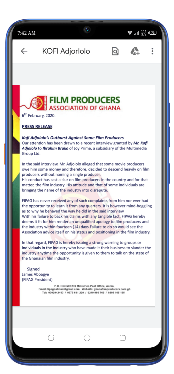 After his recent rant, the Film Producers Association of Ghana (FIPAG) has requested that veteran actor Kofi Adjorlolo renders an unqualified apology to the association for “disgracing” its members in public.