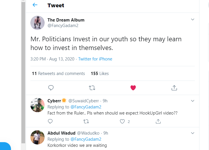 In a tweet spotted on his Twitter timeline, the 2020 International Reggae and World Music Awards (IRAWMA) Best Afrobeat Entertainer indirectly signaled an advice to our politicians on their choice of investment especially when it comes to funds from the Government.