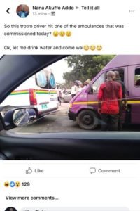 “So this trotro driver hit one of the ambulances that was commissioned today? Ok, let me drink my water and come wai”.