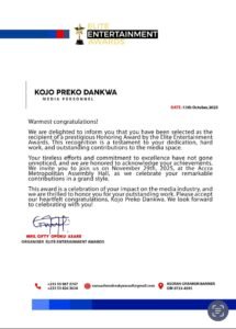 The Ghanaian media landscape is set to celebrate one of its most dynamic personalities, Kojo Preko Dankwa, as he receives a special honour at the upcoming Elite Entertainment Awards for his outstanding contributions to the creative and entertainment industry.