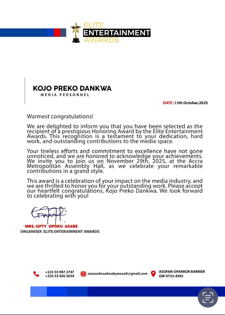 The Ghanaian media landscape is set to celebrate one of its most dynamic personalities, Kojo Preko Dankwa, as he receives a special honour at the upcoming Elite Entertainment Awards for his outstanding contributions to the creative and entertainment industry.