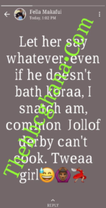 According to the post, Fella Makafui hinted that Medikal dumped Sister Derby because the lady is simply a bad cook as she can’t even prepare common Ghana jollof rice to save her relationship.