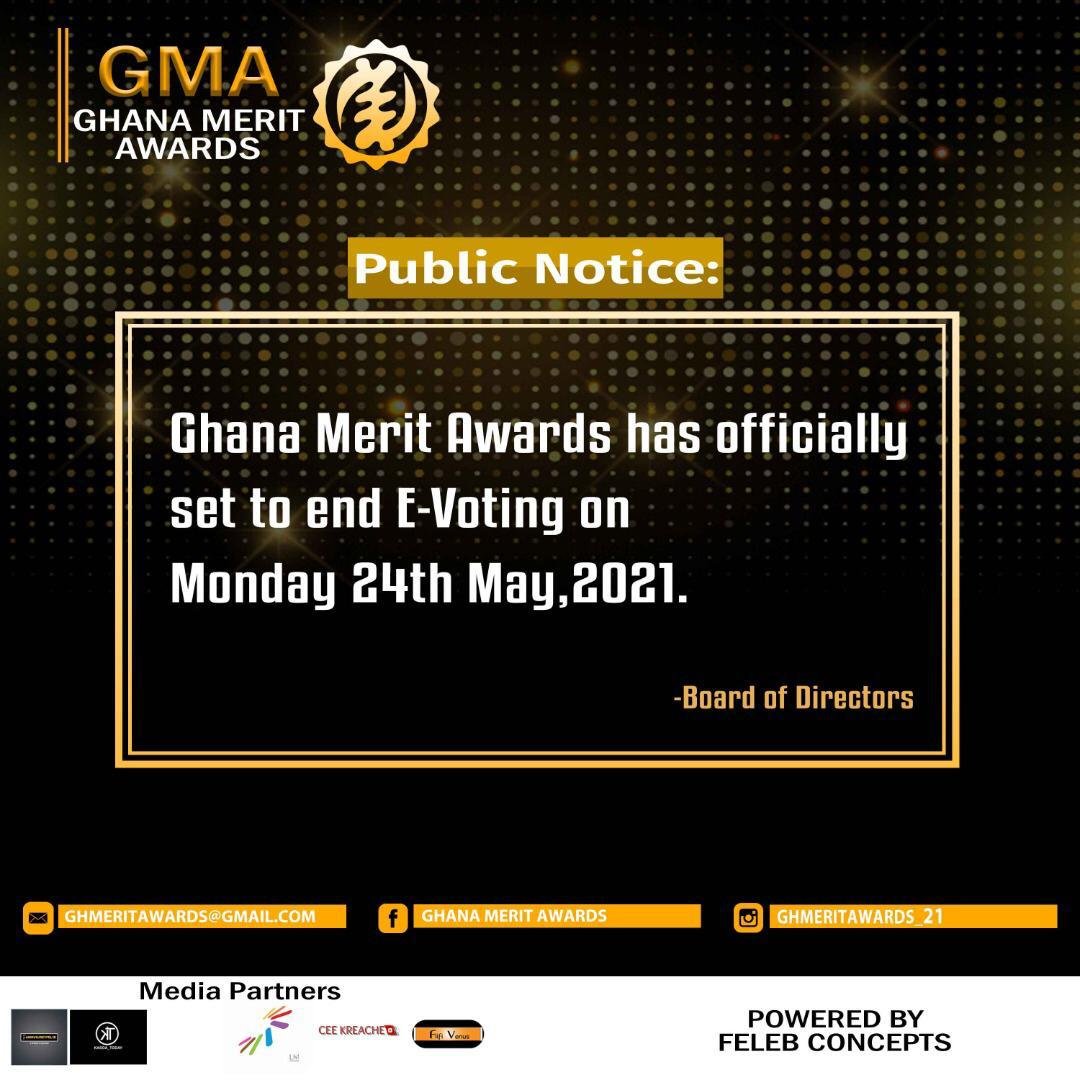 Organizers of the maiden edition of Ghana merit awards has set aside 24th May, 2021 as the official closure of the electronic voting system for nominees and would like the general public and selected nominees to take note of the closing date.