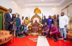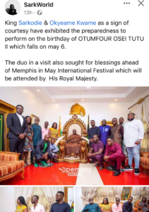 In a Facebook post sighted by ENEWSGHANA.COM, one of the affiliates groups of Sarkodie called SarkWorld posted pictures of Sarkodie, Okyeame Kwame, Dentaa of GUBA fame together with their managers and other dignitaries paying a courtesy call on his Royal Majesty at the Manhyia Palace.